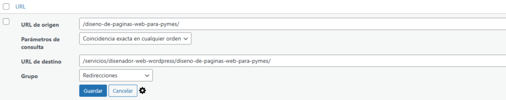 Y esto es lo más sencillo, arriba pones la URL que quieres que sea la de origen y abajo la de destino. Así de sencillo. Así podrás redirigir a los usuarios de tu web que caigan en la página de arriba hacia la de abajo. Bien sencillo, rápido y fácil.